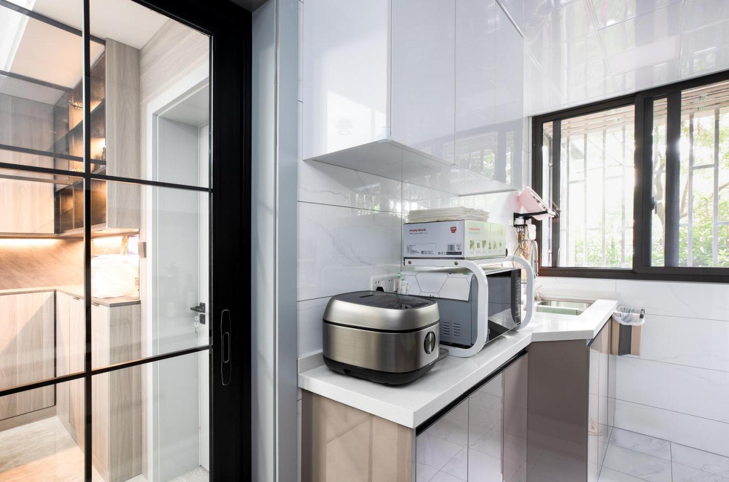 除卻隨處可見的采光設計,可以讓自然光不受限制地引入,燈光也是空間里不可或缺的部分。 挑空處精心設置的吊燈,猶如皎潔的明月,含蓄、巧妙地為空間褪去冰冷外衣